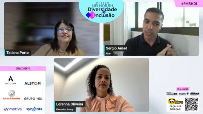 Tatiana Barrocal Porto, executiva de RH com 25 anos de experiência, mediou o painel sobre sobrecarga em grupos de afinidade. Ela destacou o desafio de recrutar voluntários para grupos minorizados. “Isso gera acúmulo de funções e sensação de solidão na agenda DEI”, lamentou. Ao lado dela, Lorenna Oliveira, gerente de DEI na Electrolux Group América Latina, e Sergio Amad, CEO da fiter, debateram soluções práticas.