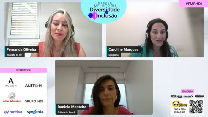 Daniela Monteiro, diretora de Pessoas e Marca da Editora do Brasil, mediou o painel sobre vieses em algoritmos de IA. Ela citou que 56% da população brasileira é preta, mas só 6,3% chega a cargos de gestão. Ela questionou o papel da tecnologia em excluir talentos minorizados. Ao lado dela, Fernanda Padilha de Oliveira, analista de RH na Metadados, e Caroline Marques, gerente sênior de RH na Syngenta, defenderam o apoio da IA sendo calibrada por humanos.