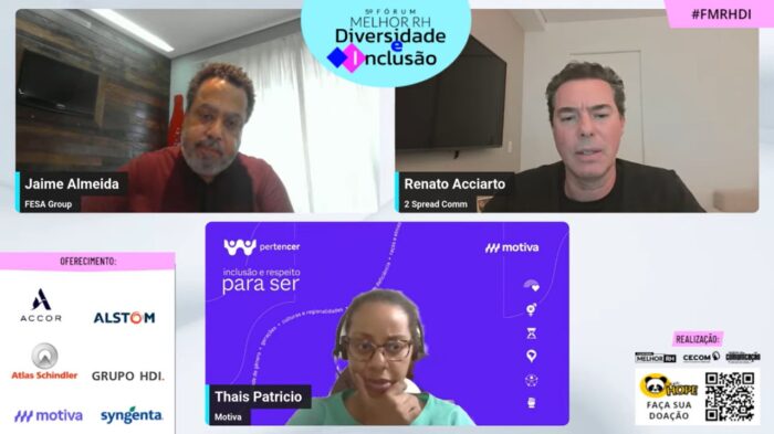 Renato Acciarto, jornalista e CEO da 2Spread Com, mediou o painel sobre reflexos do racismo na ascensão corporativa. Ele questionou por que a agenda de gênero avança mais rápido que a racial e de PCD. “Empresas pegaram o caminho do gênero, mas negros e PCDs ficam para trás”, criticou. Thais Patrício, gerente de DEI do Grupo Motiva, e Jaime Almeida, vice-presidente de DEI e sócio da FESA Group, analisaram o momento atual.