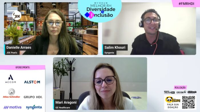 Mariane Aragoni, diretora de RH Latam na GE Healthcare, debateu inclusão digital com Salim Khouri e Danielle Arraes. Ela defendeu cultura onde profissionais admitam não saber e peçam ajuda. Tecnologia deve ser copiloto na carreira individual de todos. Salim Khouri, diretor de Talentos e Cultura e líder global de DEI na Syngenta, e Danielle Arraes, diretora de RH Latam na JDE Peet’s, compartilharam práticas multigeracionais.