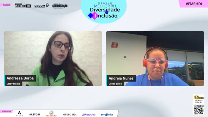 Andressa Borba, diretora de Impacto Positivo e Comunicação Corporativa da Leroy Merlin Brasil, conversou com Andreia Fernandes Nunes, diretora executiva de Gente, Gestão e Assuntos Corporativos do Grupo Casas Bahia, sobre avanços reais em DEI no varejo. Elas comentaram que superam cotas legais com metas internas ousadas para PCD e mulheres na liderança.
